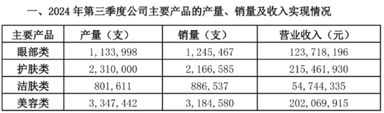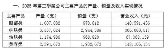 数据也支撑这一判断。2025年第三季度,公司眼部类产品产量和销量同比分别减少12.67万支和26.67万支。美容类产品下滑更为明显,产量和销量同比大幅下降95.28万支和125.19万支。尽管护肤类和洁肤类产品产销有所增长,但整体来看,产线扩建的确并不紧迫。